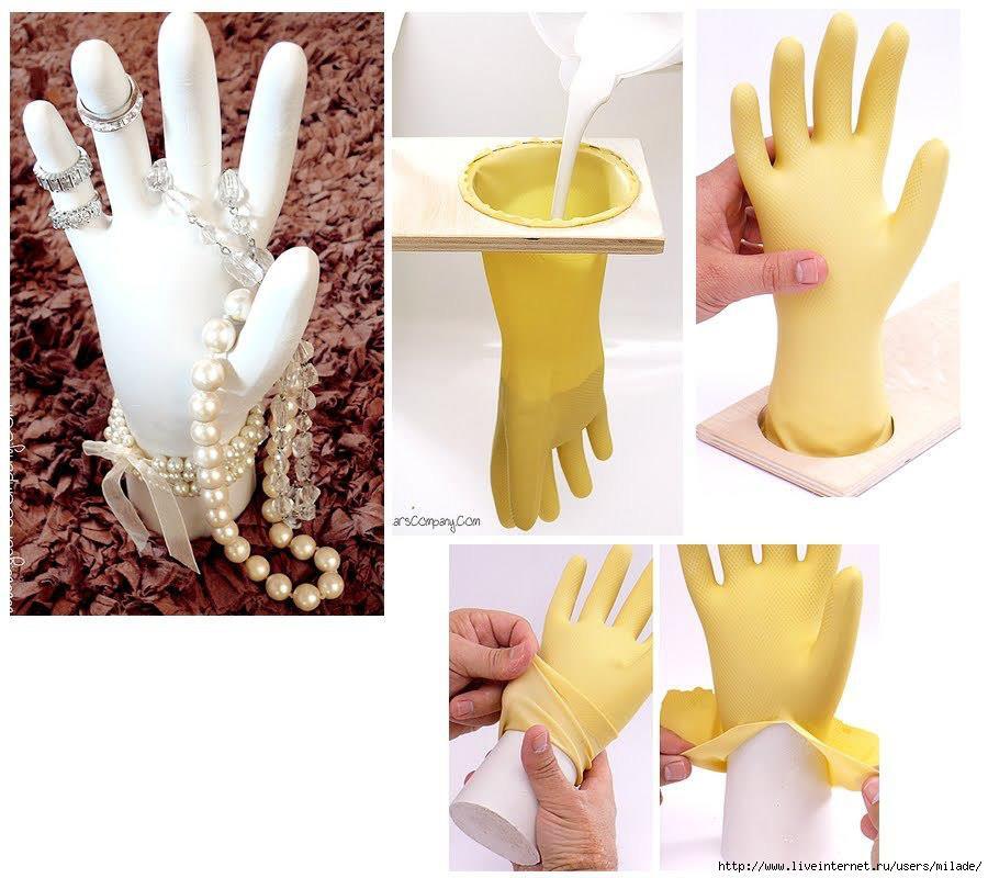 طريقة العمل: يضاف كلّ من الجبس والماء في الوعاء الكبير بحسب الكميات الموضحة على كيس الجبس، ويحركان معاً حتى يشكلان خليطاً متجانساً متوسط القوام بين الليونة والصلابة. يسكب الجبس في القفازات المطاطية باستخدام المغرفة حتى تمتلئ به بالكامل. يترك الحبس في القفازات حتى يجف تماماً ويصبح صلباً ومتحجراً. يتم شرط جزء صغير من القفاز باستخدام الشفرة الحادة حتى يسهل مزعه ونزعه عن مجسم اليد المصنوع من الجبس، مع اتباع هذه الطريقة مع باقي القفازات المعبئة بالجبس. تُرش مجسمات الأيدي الناتجة بألوان الرش، ويفضل اعتماد الألوان الحيادية كالذهبي والفضي والأسود؛ وذلك لعدم بطلان موضتها مهما مر عليها من وقت قبل بيعها. تُترك المجسمات حتى تجف، ثمّ تُدهن منطقة القاعة بالصمغ اللاصق وتُلف بالشرائط الملوّنة.